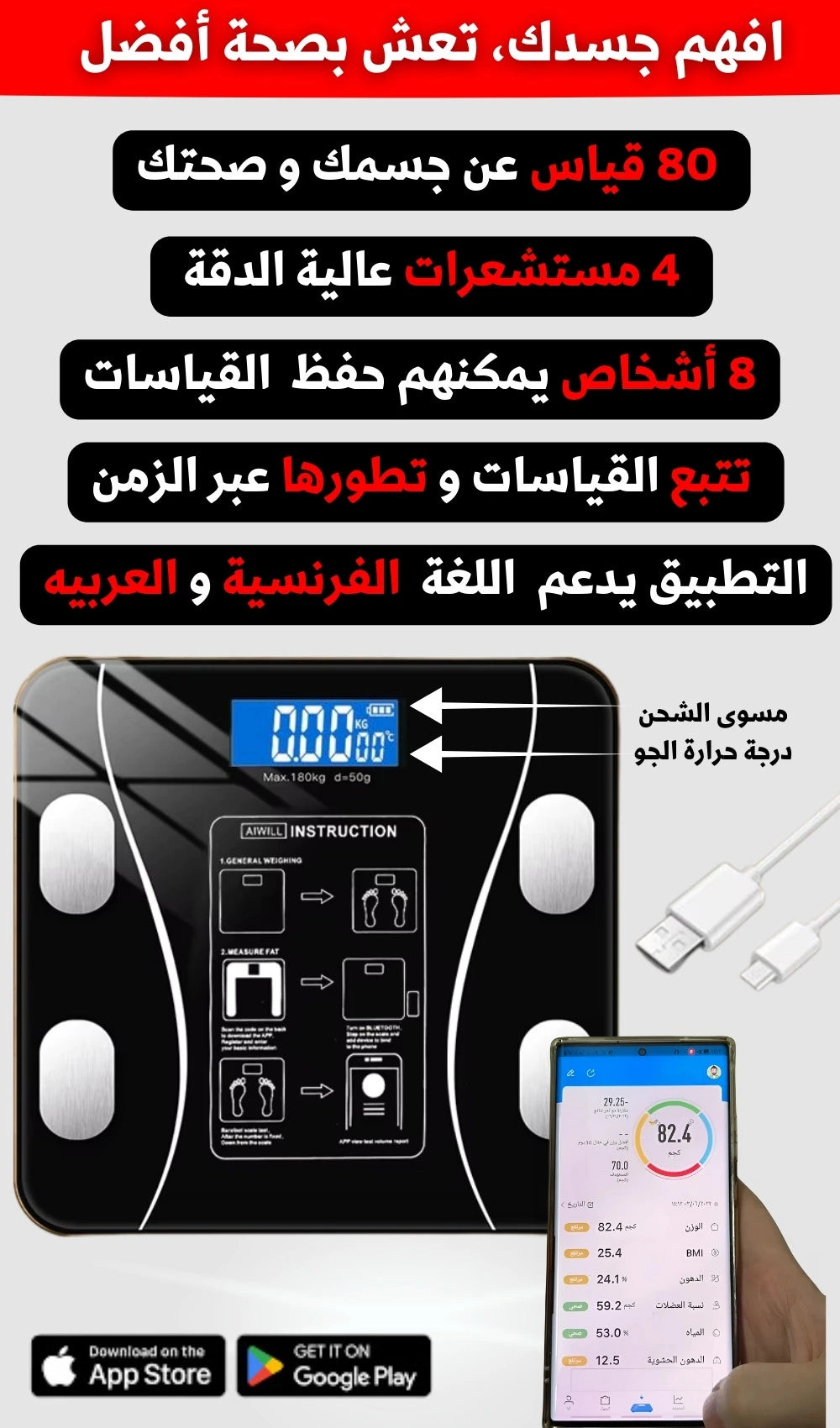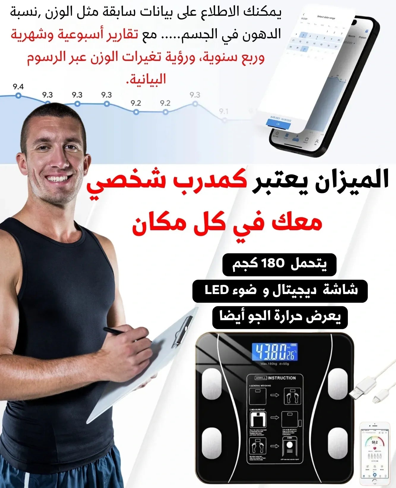 -اشحنه بكابل الشحن المرفق لمدة ساعة (فتستعمله كميزان متنقل لمدة شهرين أو أكثر)- بعد ما تحمل